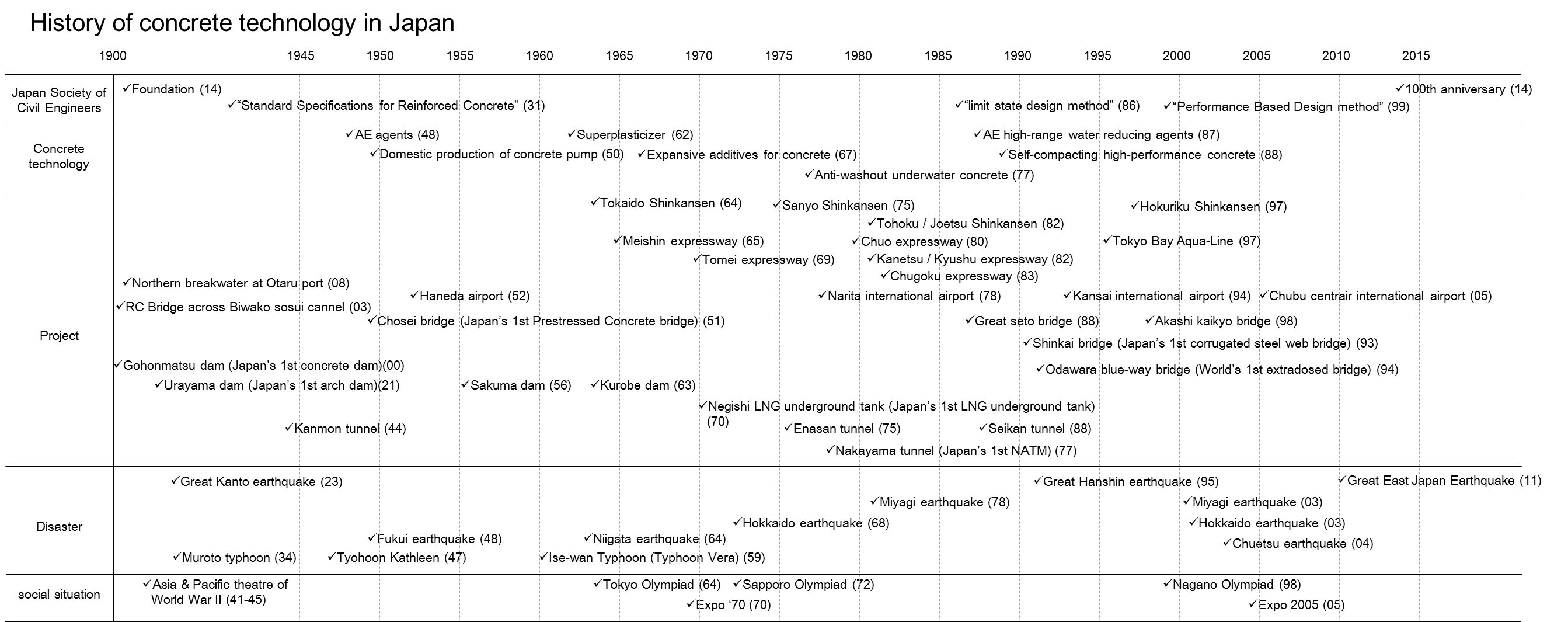 | JSCE was founded in 1914, and in 2014 it celebrated its 100th anniversary. Development of concrete technologies in Japan also began about 100 years ago. The figure below shows a brief history of concrete-related issues in Japan. There were many projects and disaster during 100 years, and they lead to the development of concrete technology. |