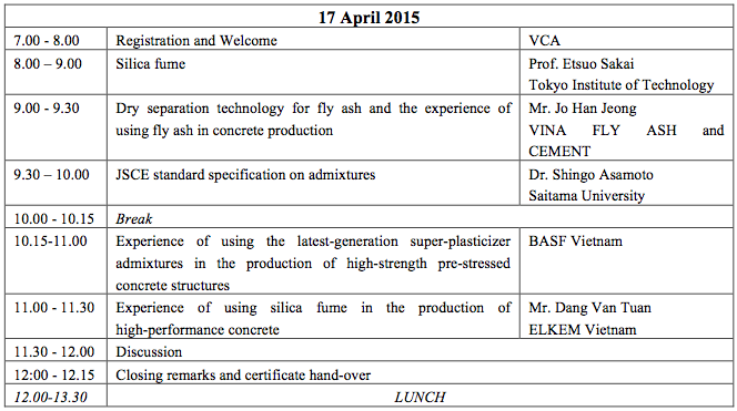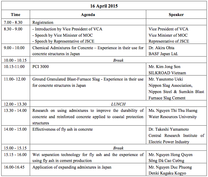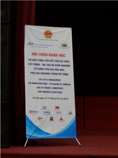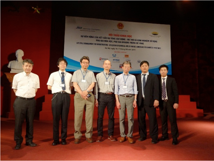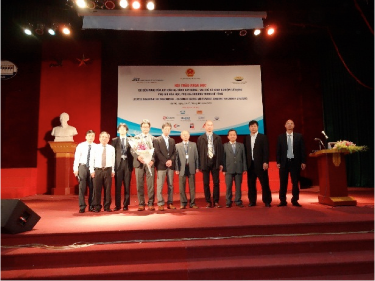 T he Seminar on Life Cycle Management for Infrastructure - Utilization of Chemical and By-product Admixtures for Concrete Structures, was held in Hanoi, Vietnam, on April 16 and 17, 2015. The seminar was organized by the Vietnam Concrete Association (VCA), JSCE, and Cross-ministerial Strategic Innovation Promotion Program (SIP). The seminar is the third joint seminar for JSCE and VCA. The first and second joint seminars were held in 2012 in Hanoi and in 2013 in Ho-Chi-Min City, respectively. In Vietnam, the annual total amount of fly ash, an industry by-product, is expected soon to reach approximately 25 million tons. Therefore, the application of this by-product to concrete admixtures is becoming urgent. On the other hand, the maintenance of concrete structures is also a topic of concern in Vietnam. Both by-product admixtures and high-performance chemical admixtures are expected to enhance the durability of concrete structures. The theme of this seminar reflects these situations in Vietnam. Approximately 150 engineers and researchers attended this seminar. The Vietnamese deputy minister of construction and president of the VCA, Lê Quang Hùng, as well as the vice director of the Department of Science and Technology, the vice president of the Vietnam Society of Civil Engineering and the vice president of Water Resources University attended as guests. The seminar opened with an address by Mr. Nguyern The Hung (vice president of VCA). Dr. Etsuro Sakai (Professor, Tokyo Institute of Technology) spoke on behalf of the Japanese speakers. Five Japanese speakers made presentations about basic characteristics, the latest Japanese technology, application examples, and standard specifications for concrete admixtures. Dr. Akira Ohta (BASF Japan Co., Ltd.) spoke about chemical admixtures for concrete. Mr. Yasukazu Ueki (Nippon Slag Association and Nippon Steel Sumikin Blast furnace Cement Co., Ltd.) gave a presentation on blast furnace slag. Dr. Takeshi Yamamoto (Central Research Institute of Electric Power Industry) gave a presentation on fly ash. Prof. Etsuro Sakai gave a presentation on silica fume. Dr. Asamoto (Associate professor, Saitama University) introduced the JSCE standard specification for admixtures. Three speakers from VCA made presentations. Mr. Kim Jong Son (Silkroad Vietnam) introduced their admixture product and the development technology behind it. Ms. Naguyen Thi Thu Huong (Water Resource University) gave a presentation on general knowledge regarding the applicability of admixtures for marine structures. Mr. Nguyen Duc Phuong (Denki Kagaku Kogyo) talked about the application of expanding admixtures in Japan. During the discussion period, many topics of high concern for Vietnamese engineers regarding developing technologies were discussed. These topics included a new theoretical chemical admixture for use as an accelerator, agendas for Vietnam to establish design codes on the durability of concrete structures built using admixtures, mix design and strength design specifications for high-strength concrete, the consideration of admixture reactions when verifying thermal cracking, and so on. In the seminar, VCA stated its intentions to continue holding joint seminars and enhancing technological exchanges in order to consolidate their standards. The joint seminar ended in great success. |