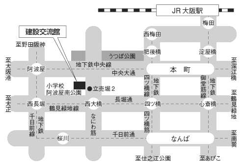 | ● 会 場 | : | 建設交流館8階グリーンホール 大阪市西区立売堀2-1-2 TEL:06-6543-2551 地下鉄四つ橋線「本町」駅 22、23番出口より徒歩5分 地下鉄中央線「阿波座」駅 2番出口より徒歩5分 |