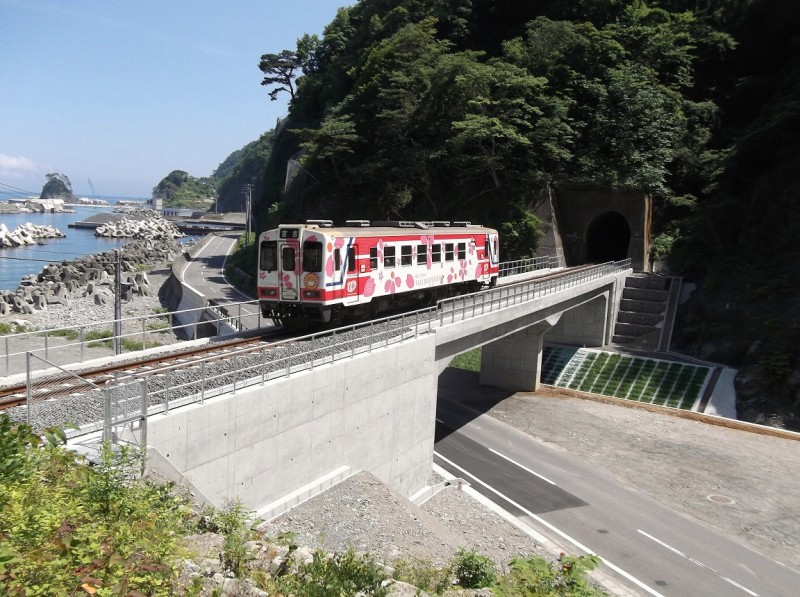 企業者: 独立行政法人鉄道建設・運輸施設整備支援機構鉄道建設本部東京支社、三陸鉄道株式会社 設計者: 八千代エンジニヤリング株式会社 施工者: 東急・小山特定建設工事共同企業体 所在地: 岩手県下閉伊郡田野畑村 構造形式: (上部構造)2径間連続下路SRC補強盛土一体橋梁 床版構造:SRC床版